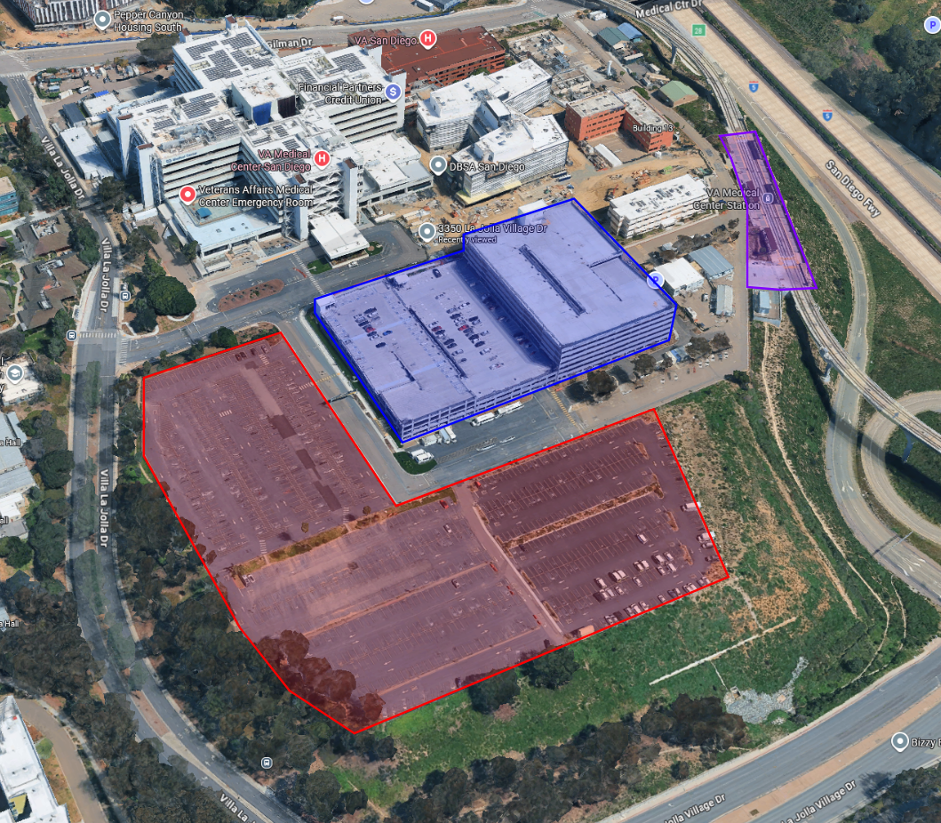 Currently, parking at the VA is limited. We recommend the trolley drop off sites which include the VA Medical Center Station, or the Nobel Drive Station is 1 stop away and Uber/Lyft offer a reasonable drop off to the facility. Parking is also adjacent to the VA at shops and eateries at La Jolla Village Square. The map below shows parking areas in red or blue, but these are risky in securing spots.